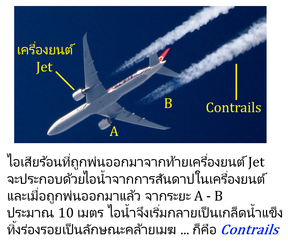 สิ่งหนึ่งที่เรามักจะเห็นบนท้องฟ้าบ่อย ๆ คือเส้นสีขา เป็นทางยาวคล้ายกับปรากฎการณ์ที่น่าตื่นเต้น ให้อารมณ์แบบมนุษย์ต่างดาวอะไรอย่างนี้ จริง ๆ แล้วมันคือ Contrail ย่อมาจาก Condensation Trails มันเป็นไอน้ำที่ควบแน่นจากท้ายเครื่องยนต์เครื่องบินจากไอร้อนที่ออกมาจากท้ายเครื่อง Jet แล้วกระทบกับความเย็นจัดของอากาศบนนั้นจึงทิ้งไอน้ำเป็นทางยาวขาว ๆ ใว้ครับ