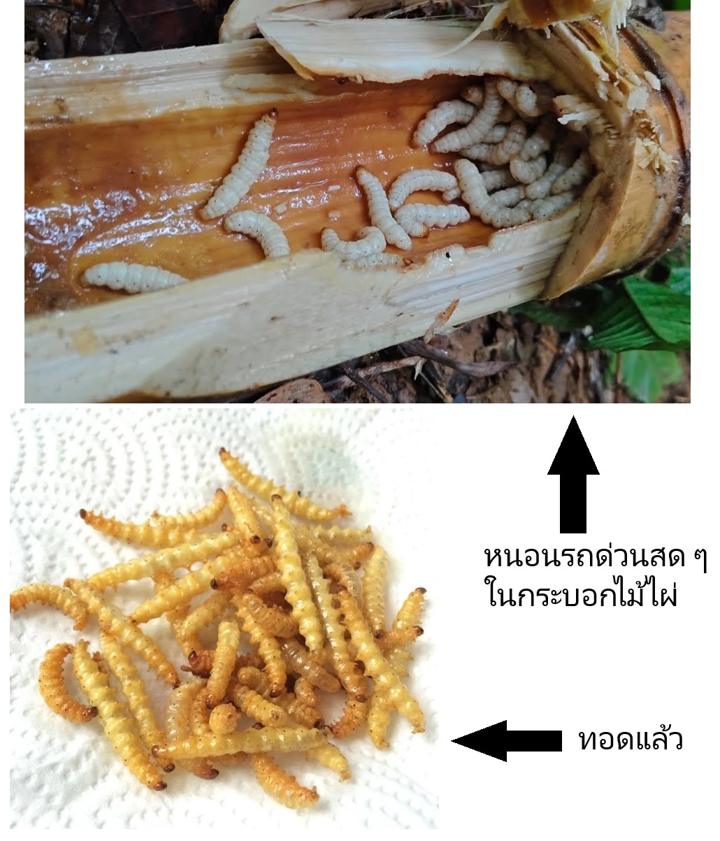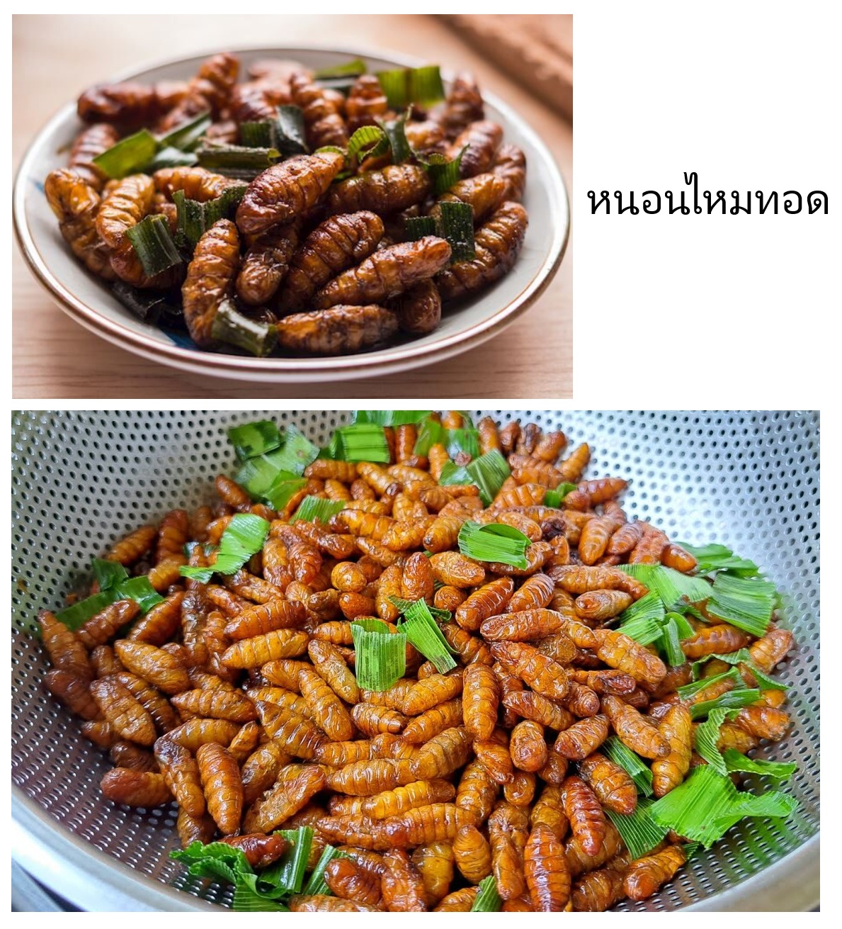 หนอนอีกประเภทหนึ่งที่หลายท่านน่าจะชอบกินมากกว่าหนอนไม้ไผ่ก็คือ “หนอนไหม” (Eri silkworm) จริง ๆ แล้วที่เราทอดกินกัน (ตามภาพล่าง) มันไม่ใช่ช่วง “หนอน” ครับ แต่มันเป็นช่วง “ดักแด้” ของหนอน Silkworm Samia ricini ซึ่งจะมีไขมันสะสมเยอะกว่า ตัวอ้วนพี เคี้ยวแล้วจะเค็ม ๆ มัน ๆ หอมอร่อยมากกว่าหนอนไม้ไผ่เยอะเลยครับ ผมว่าหนอนไม้ไผ่เคี้ยวแล้วมันกลวง ๆ เหมือนขนมราคาถูก 😸🤣😂