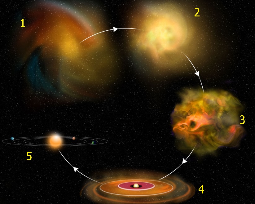 1. กลุ่มแก้ส Hydrogen และ ฝุ่นที่เป็นละอองธาตุหนักต่าง ๆ เริ่มก่อตัวเข้ามาใกล้กัน