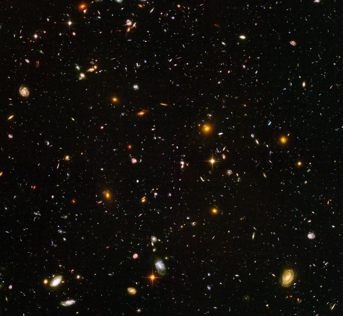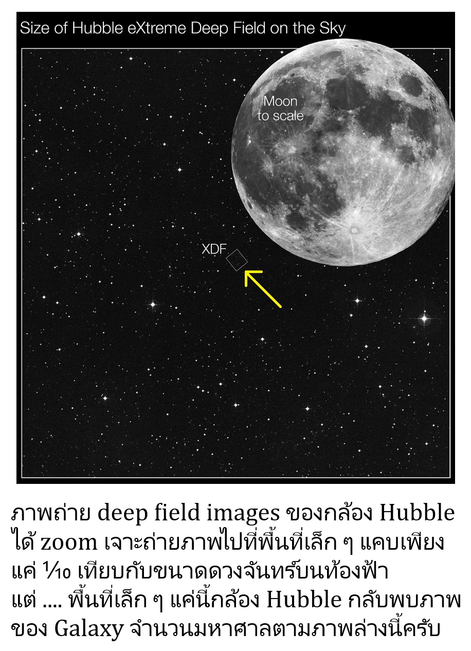 ผมขอยกตัวอย่าง เอาแบบง่ายที่สุดของภาพถ่ายแกแล็กซีที่อยู่ใกล้มาก ๆ เกินสายตามนุษย์จะมองเห็นได้  ก็คือภาพถ่ายของกล้อง Hubble ที่เรียกว่า Hubble deep field image