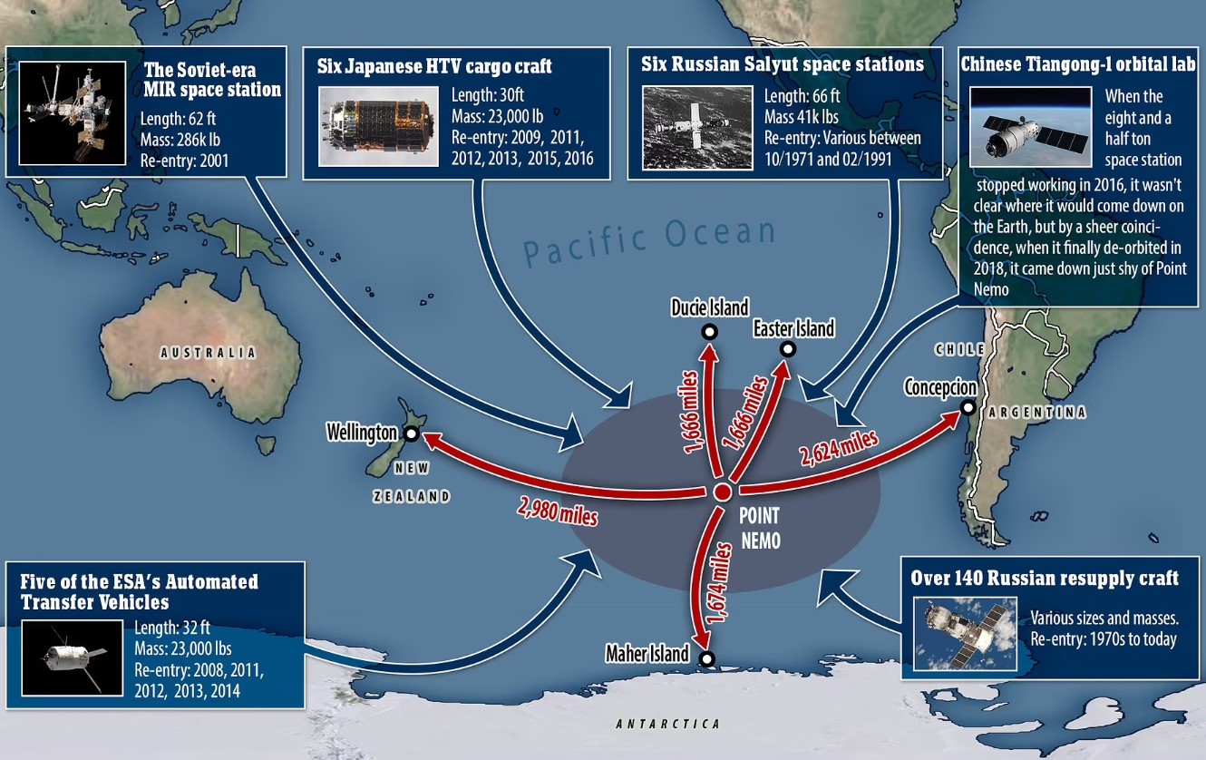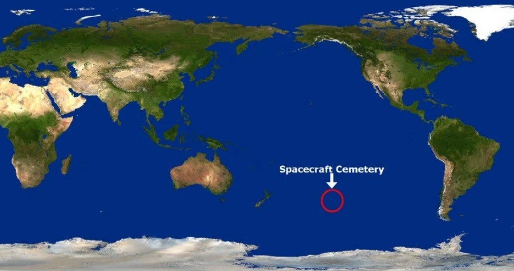 ตามปกติแล้ว พวกดาวเทียมหรือชิ้นส่วนอวกาศที่มนุษย์ส่งขึ้นไปโคจรรอบโลกจะต้องตกกลับลงมาเมื่อหมดอายุการใช้งาน แต่จะบังคับให้ตกบริเวณใดนั้น …. พื้นที่นั้นได้กำหนดแล้ว บริเวณนี้ก็คือสถานที่ที่ดีที่สุดในโลกที่จะบังคับให้ยานอวกาศหรือชิ้นส่วนอวกาศตกลงสู่โลกครับ  เรียกว่า Spacecraft cemetery (สุสานยานอวกาศ) อยู่ที่มหาสมุทรแปซิฟิกตอนใต้  บริเวณนี้เรียกอีกอย่างว่า Point Nemo  มันเป็นพื้นที่ของมหาสมุทรแปซิฟิกที่ห่างไกลจากอารยธรรมมนุษย์มากที่สุด