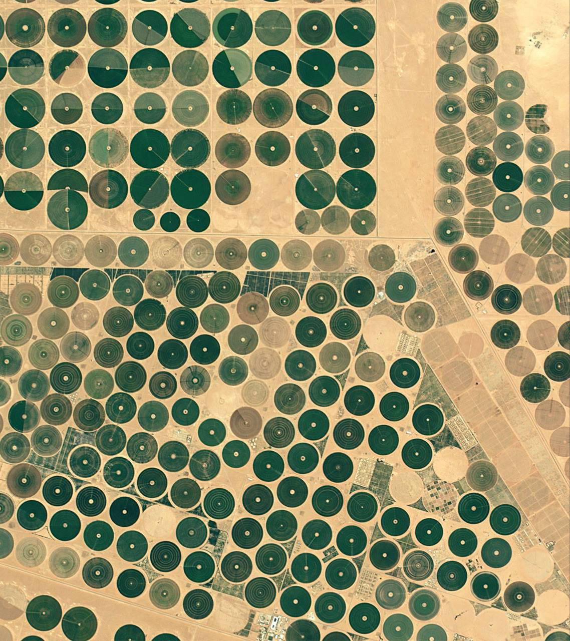 เมื่อเข้าดูใกล้ ๆ ก็เป็นพื้นที่เพาะปลูกธรรมดานี่เอง โดยให้น้ำเป็นวงกลมที่ทำเป็นวงกลมเพราะประหยัดน้ำมากกว่า และใช้แรงงานคนในการควบคุมน้อยกว่าครับรวมถึงการลดการไถพรวนหน้าดินเหมือนกับระบบให้น้ำแบบอื่นด้วย